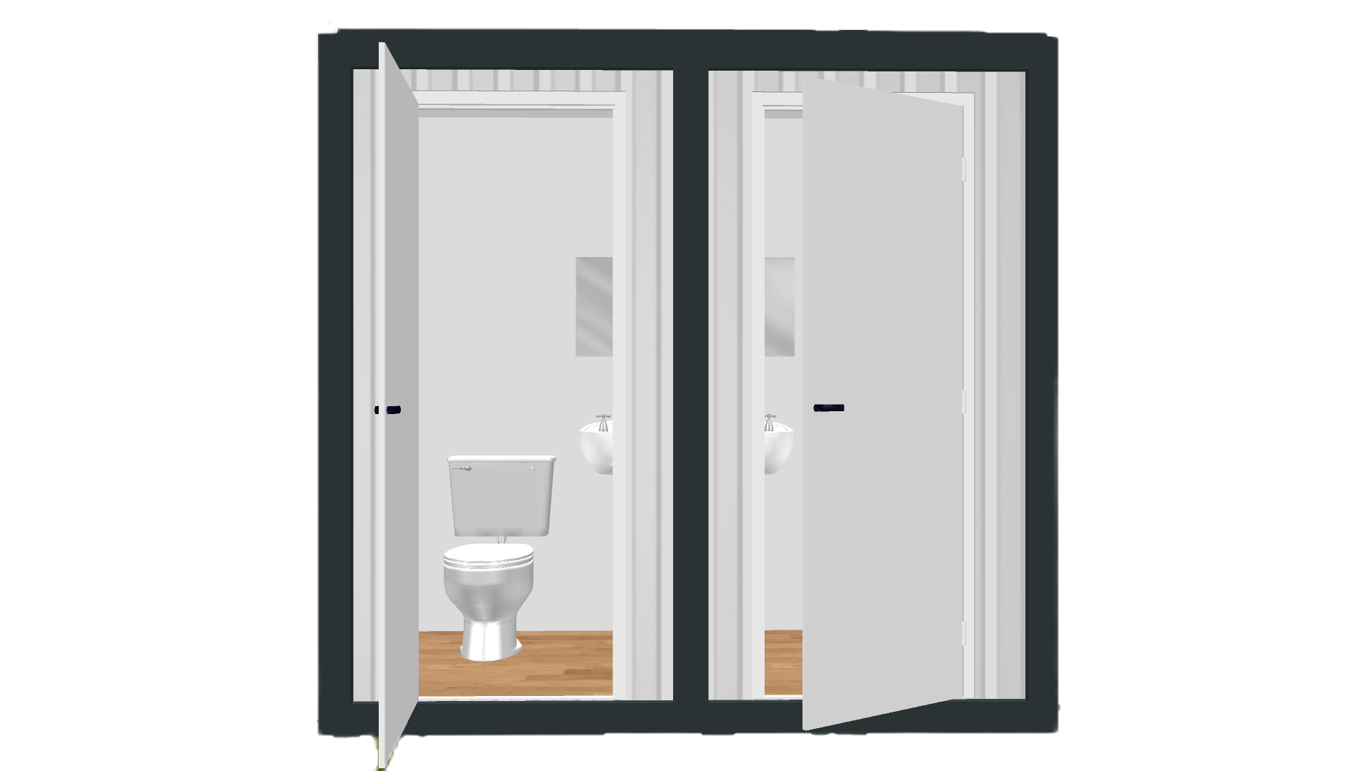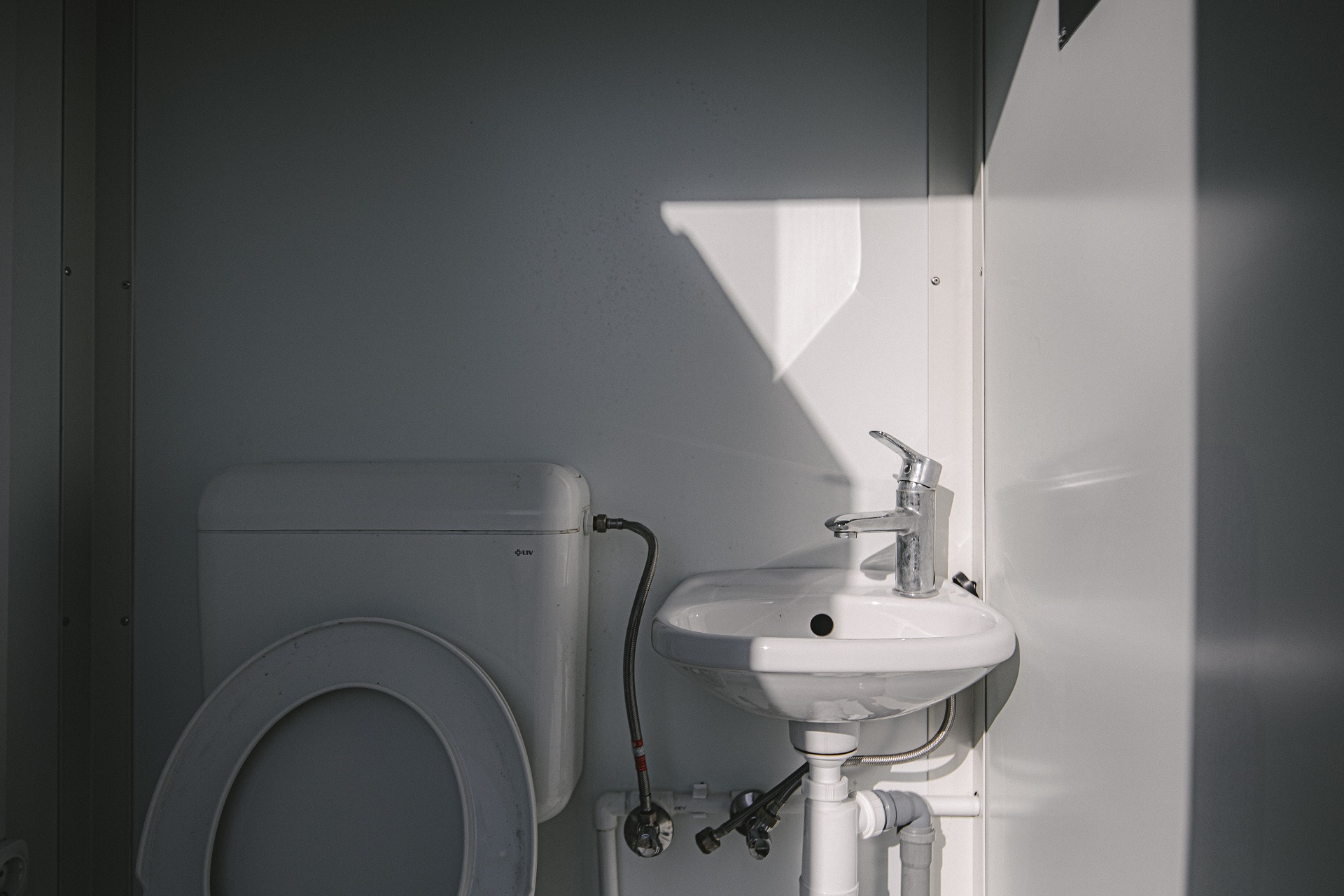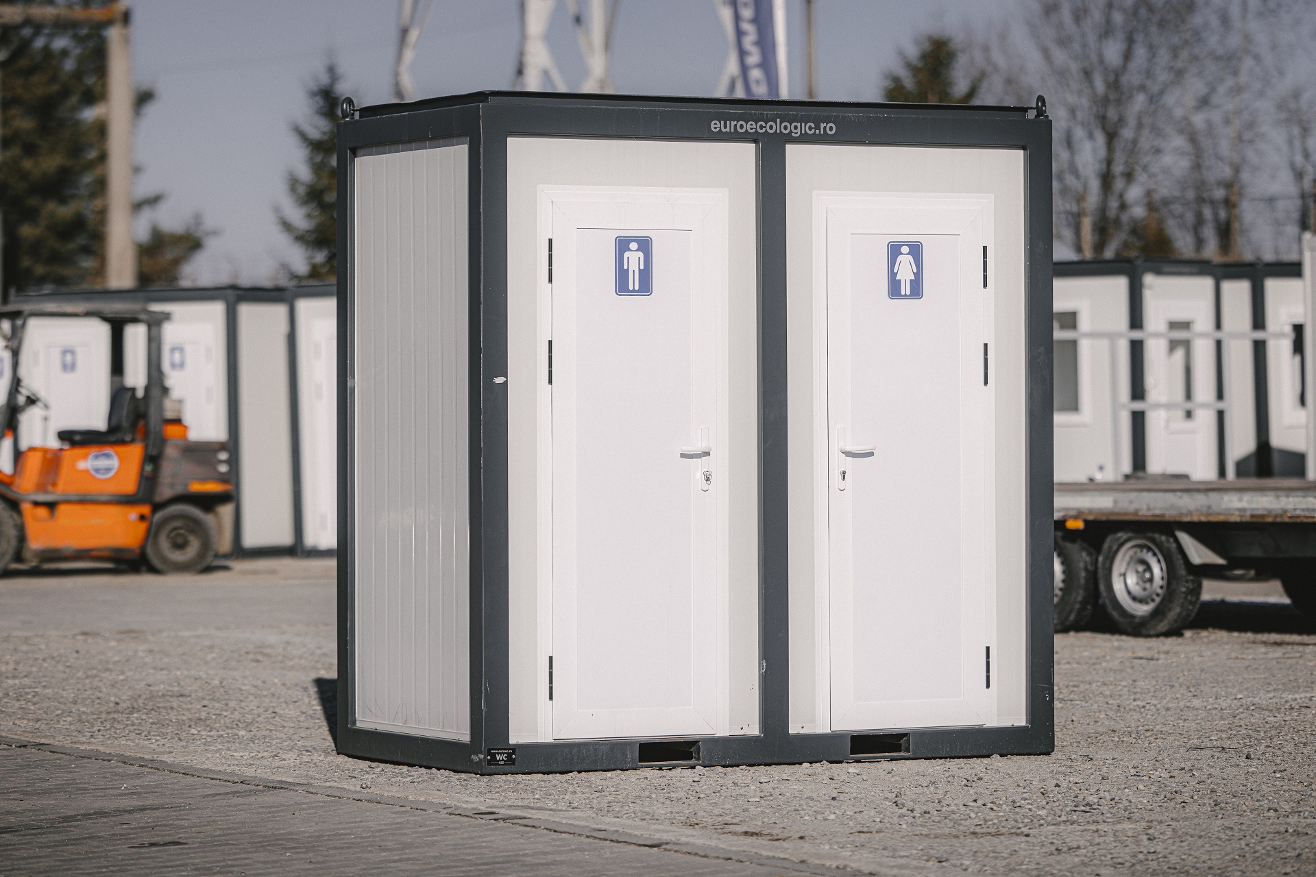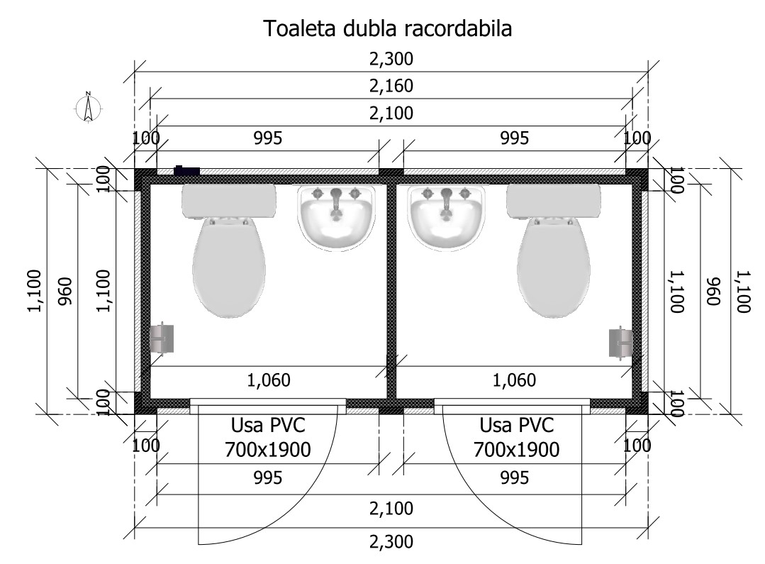 Toaletă dublă conectabilă la rețea, cu două spații separate, ideală pentru șantiere și zone publice.
